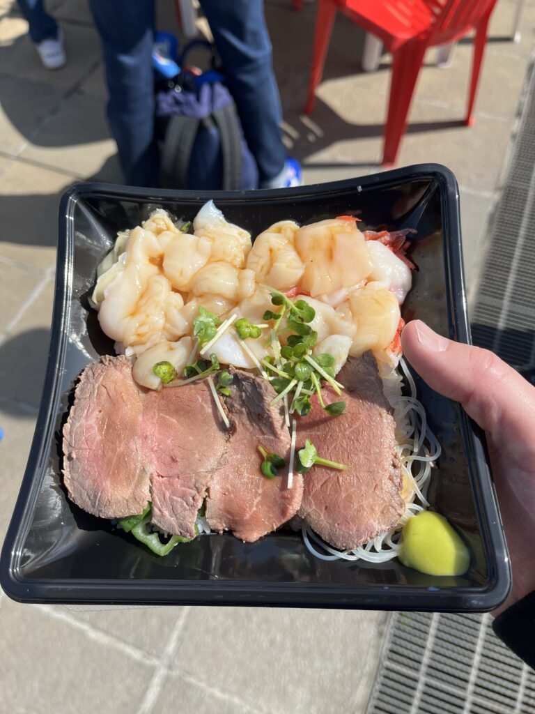 続いてトリコロールランドに戻り、宗谷岬間宮堂さんの牛たたきと帆立丼を追加購入。わさびがしっかり効いていて、帆立も牛たたきも美味しかったです。